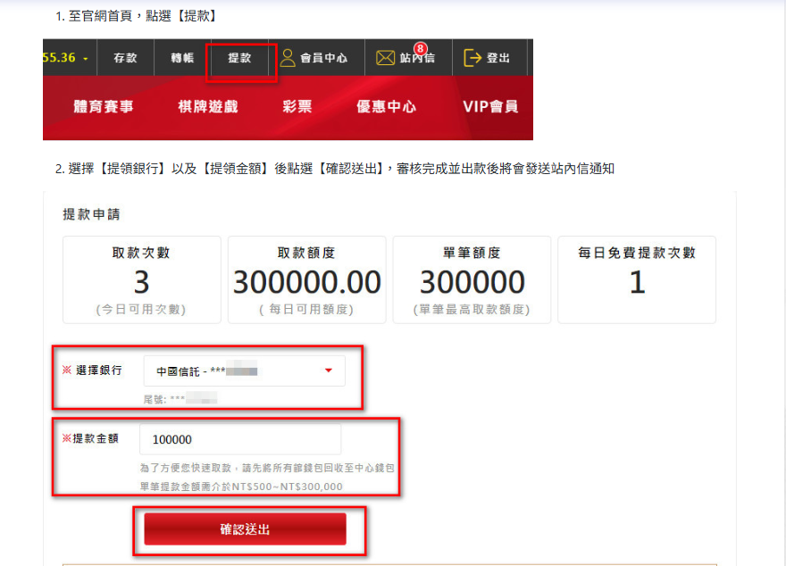 […] 完成帳號註冊後,前往「存款」頁面選擇您偏好的存款方式。請特別注意,若您在紅利尚未派發前就進行遊戲投注或館內轉帳,則視同放棄優惠資格。 […]