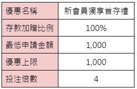 • 首次存款 1,000元,可獲得 1,000元 紅利。
