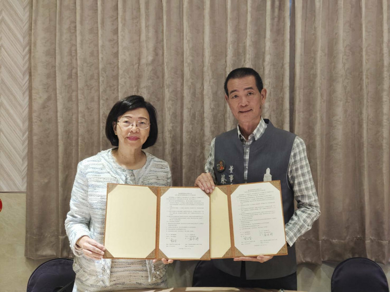 國圖館長曾淑賢(左)與北港朝天宮董事長蔡咏鍀(右)簽訂合作意向書。(國圖提供)