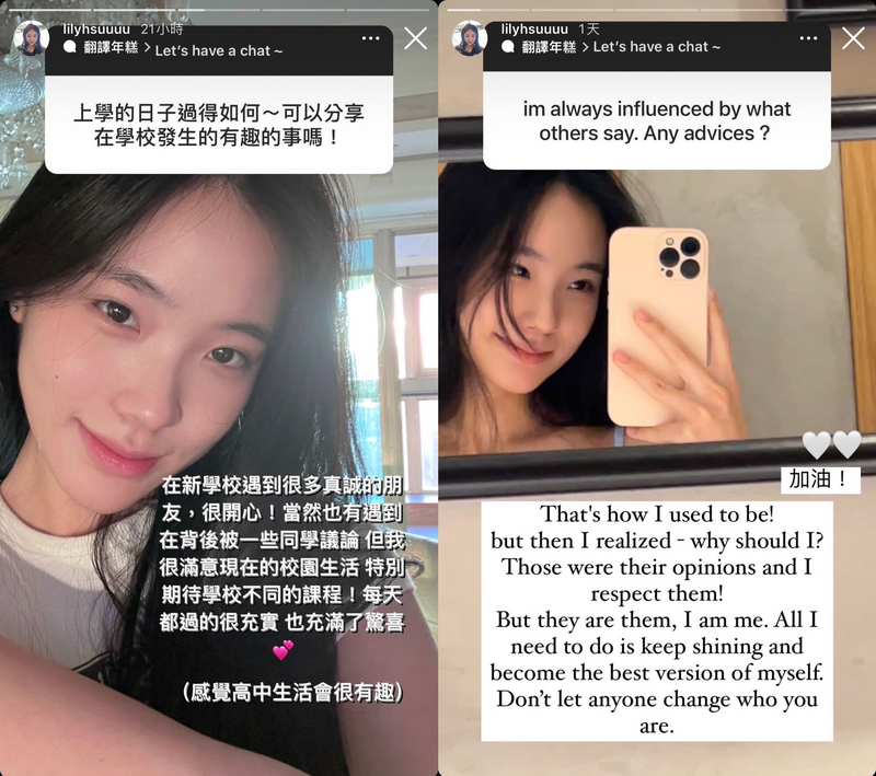 稍早也有網友以英文詢問她:「我很容易受旁人的言論影響,妳能給我一點建議嗎?」Lily則以超齡的成熟態度表示,自己曾經也這樣,但後來就覺得,「為什麼我要這樣被影響」,她強調:「他們是他們,你是你,別讓任何人改變你」,只需要成為更好的自己。