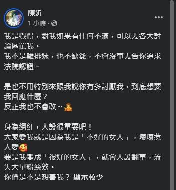 陳沂說道:「我是覺得,對我如果有任何不滿,可以去各大討論區罵我。我不是雞排妹,也不缺錢,不會沒事去告你追求法院認證。」陳沂向酸民說道:「是也不用特別來跟我說你有多討厭我,到底想要我回應什麼?反正我也不會改~」並貼出自信笑容的美照,該照片更罕見露出驚人的超深乳溝,讓人看了目不轉睛。