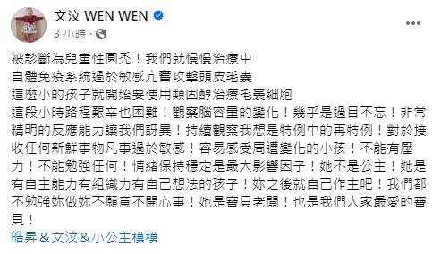 文汶在社群曝光女兒得了圓形禿。(翻攝自臉書)