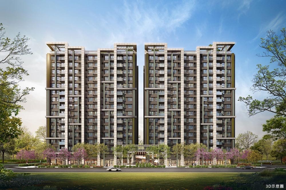 「松丹達麗」建築外觀3D模擬示意圖, 周圍環境及綠地植栽為電腦合成修飾。(圖/業者提供)