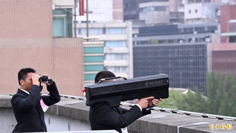 圖為政府維安人員去年國慶日當天,在高處手持無人機干擾槍保持警戒。(資料照,記者劉信德攝)