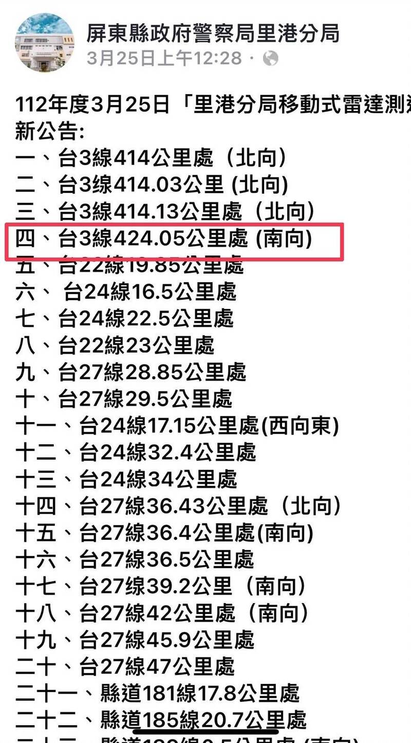 有關民眾於社群網站分享影片,里港警分局九如分駐所前設置有移動式測速照相機。里港警分局表示,因台三線與東寧路口為易肇事路口,因此不定時於該路段進行執法測速,測速地點均有公告於分局臉書專頁,並於一般道路「1百公尺至3百公尺前」設置測速取締標誌,用以警告車輛駕駛人前方路段常有測速取締執法。